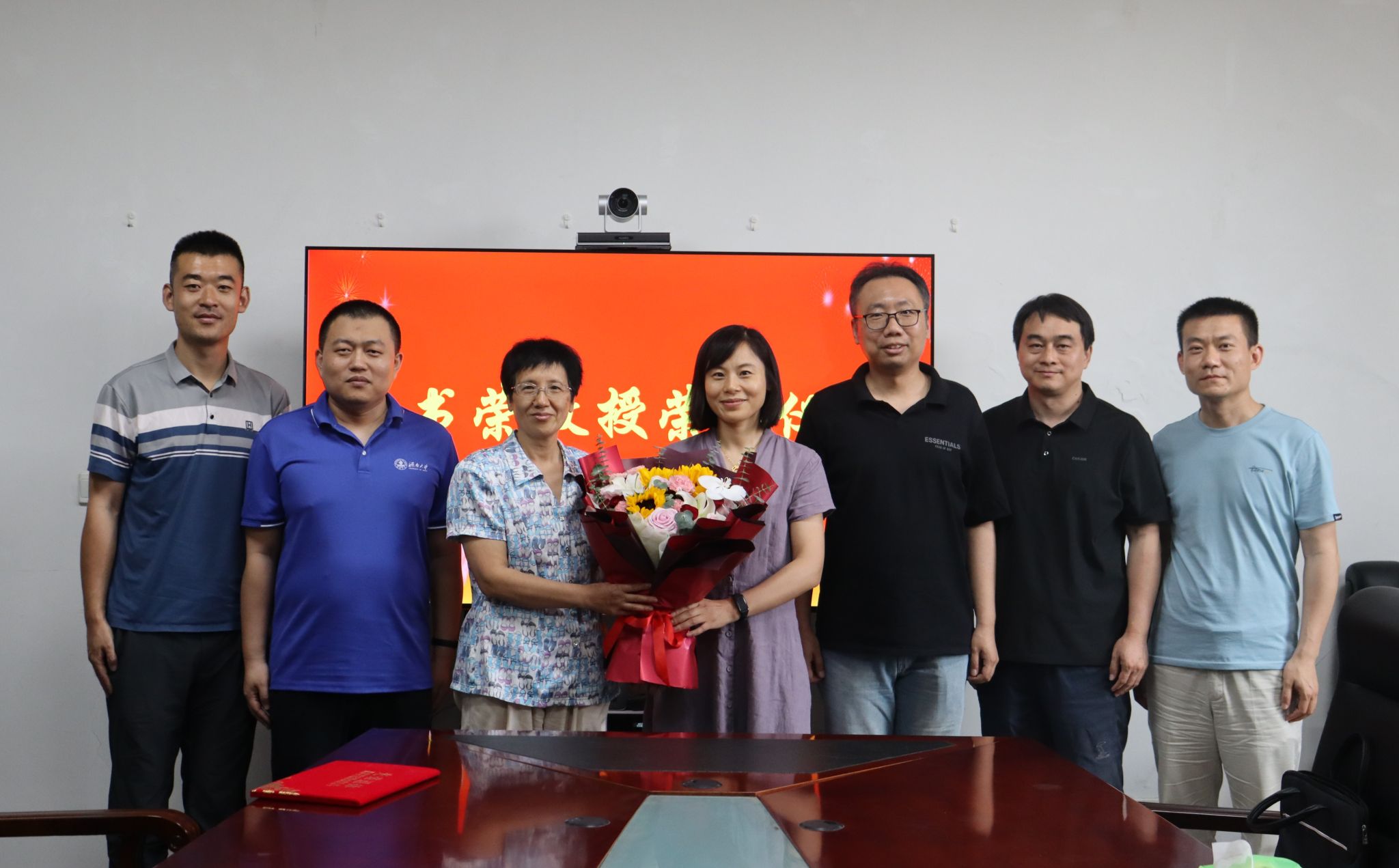 为孙书荣教授颁发荣休证书,数学系主任陈文娟等作为学生代表向孙书荣教授送上鲜花和纪念品,对孙老师的辛勤付出表示感谢,并希望孙老师能够一如既往地关心草榴社区