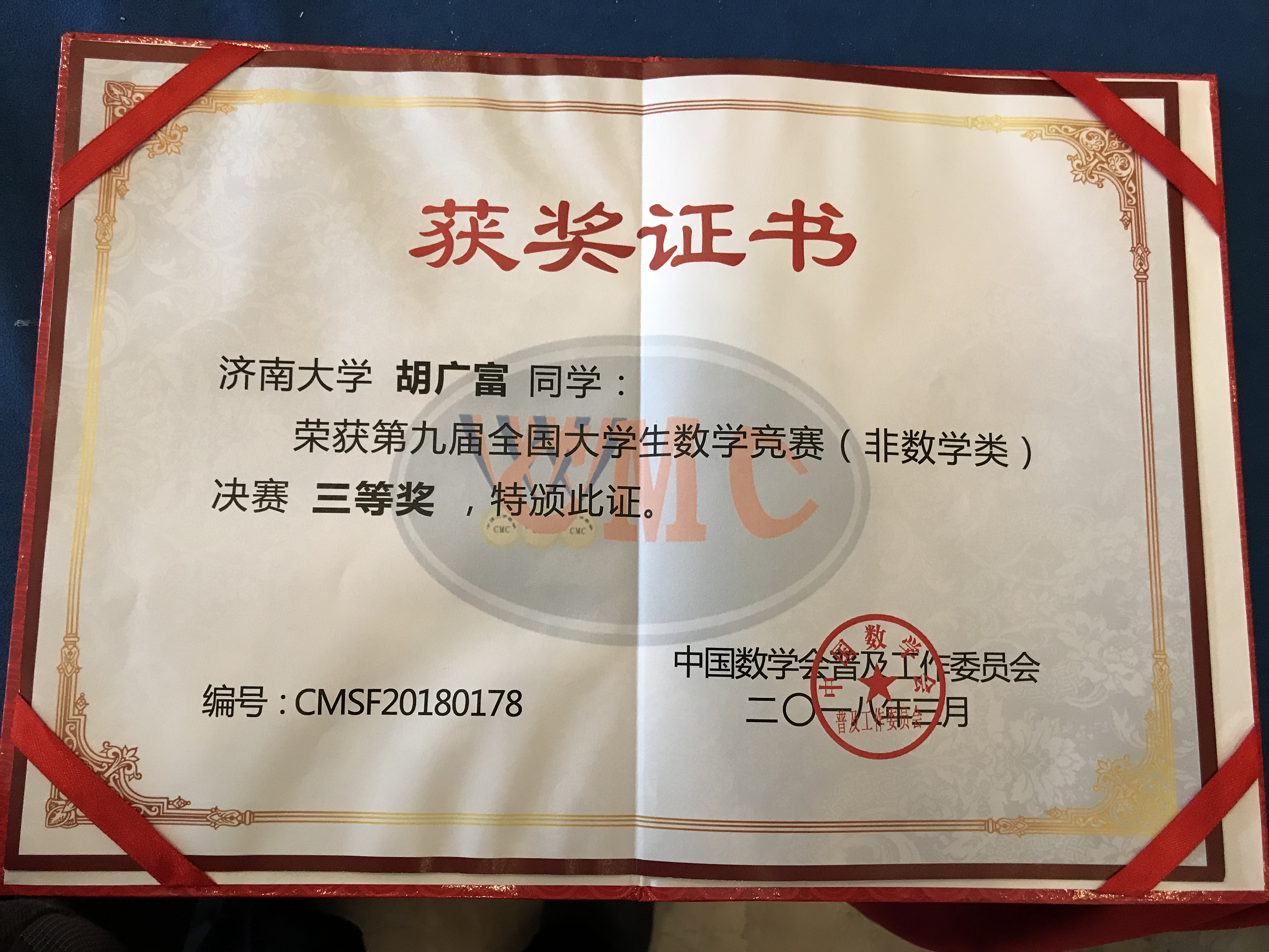 学生电气1506班胡广富同学获得全国非数学类决赛三等奖。
