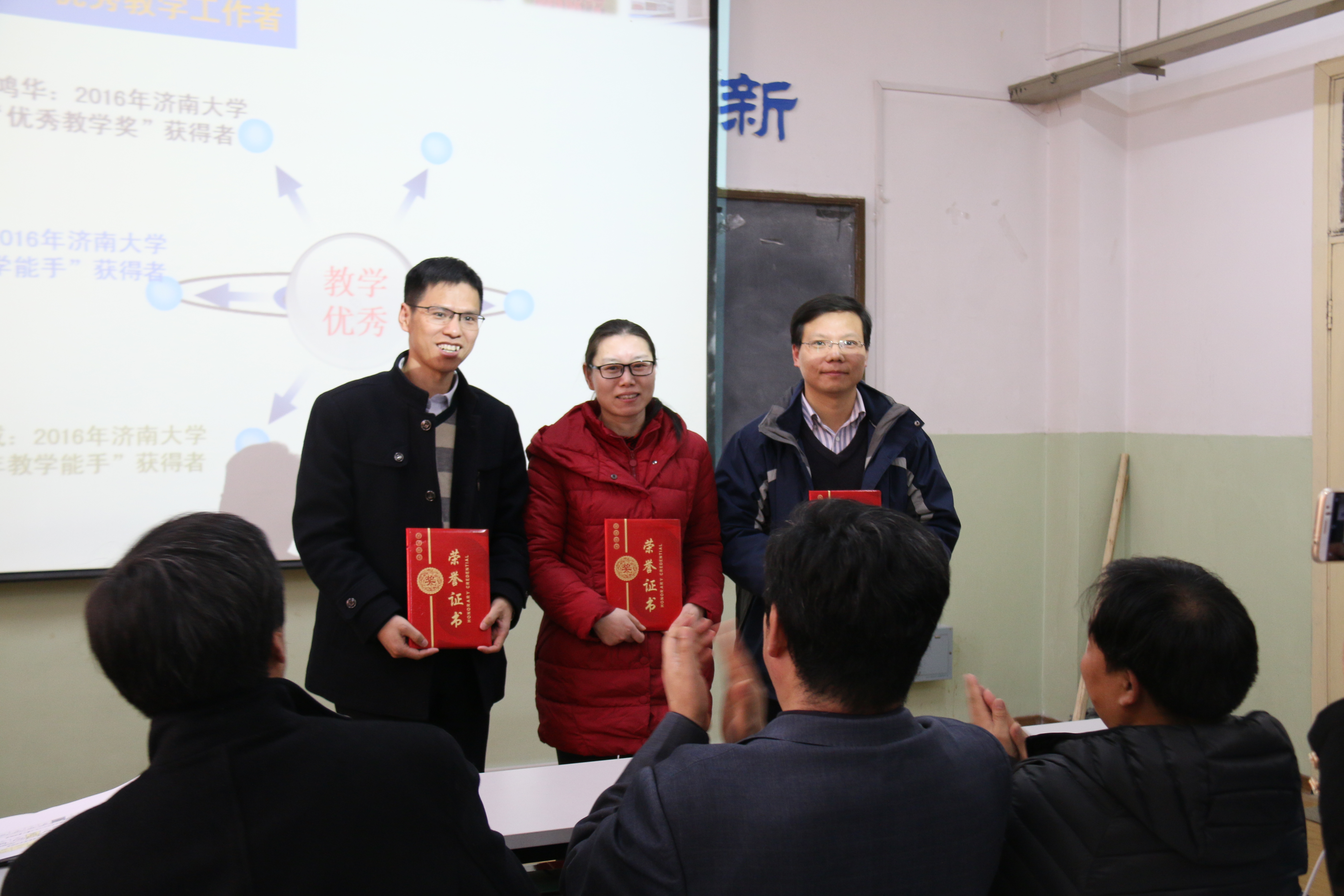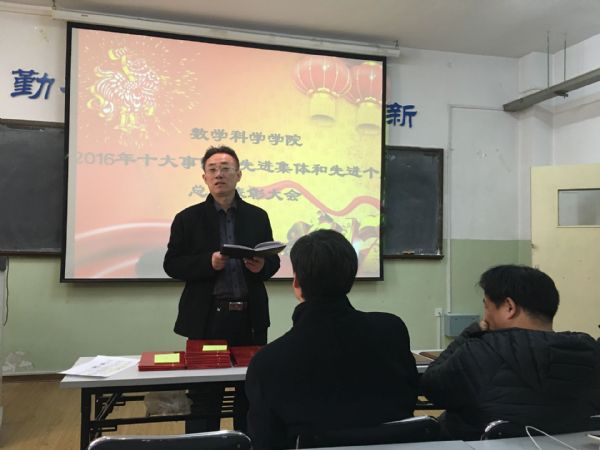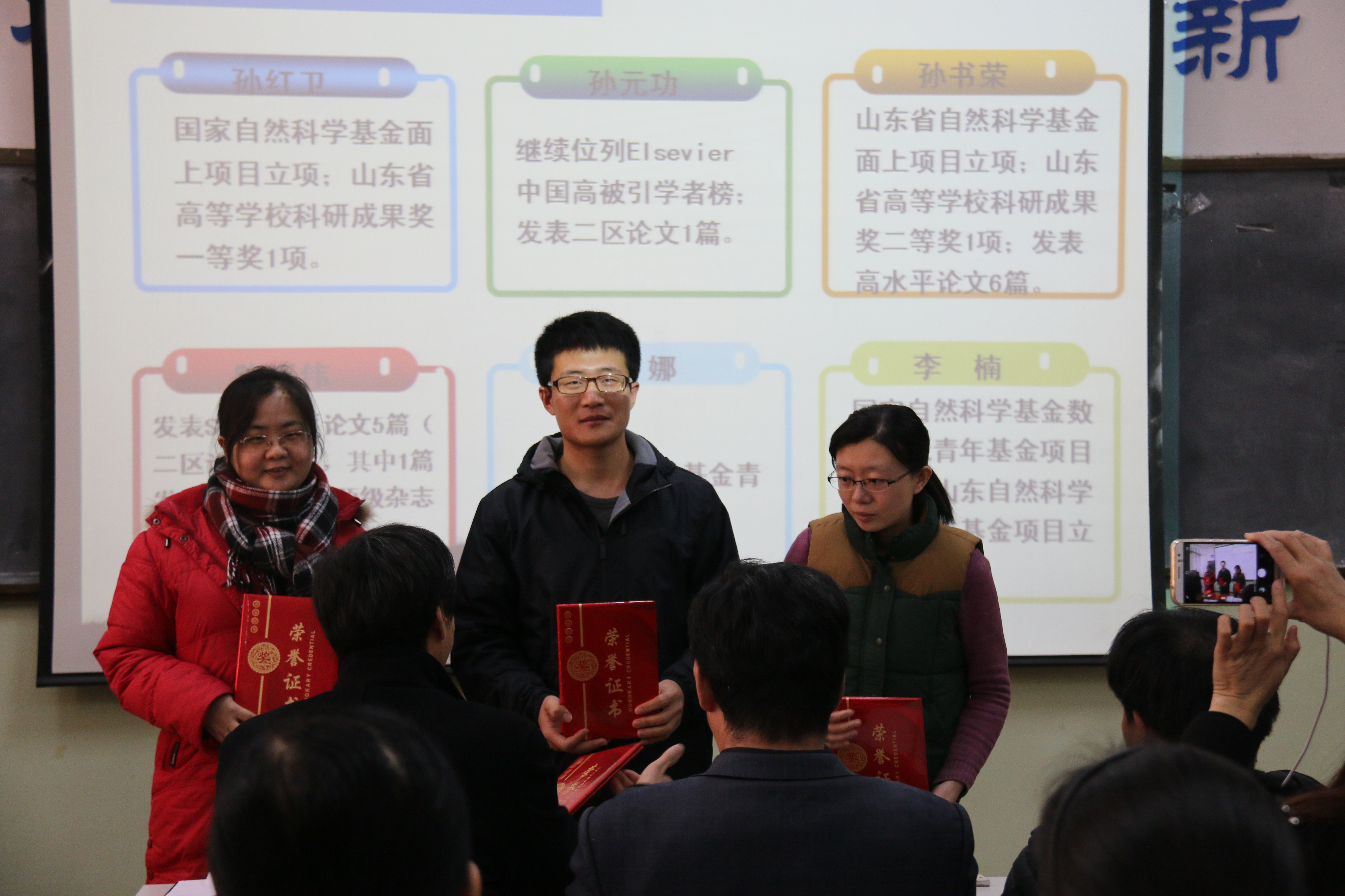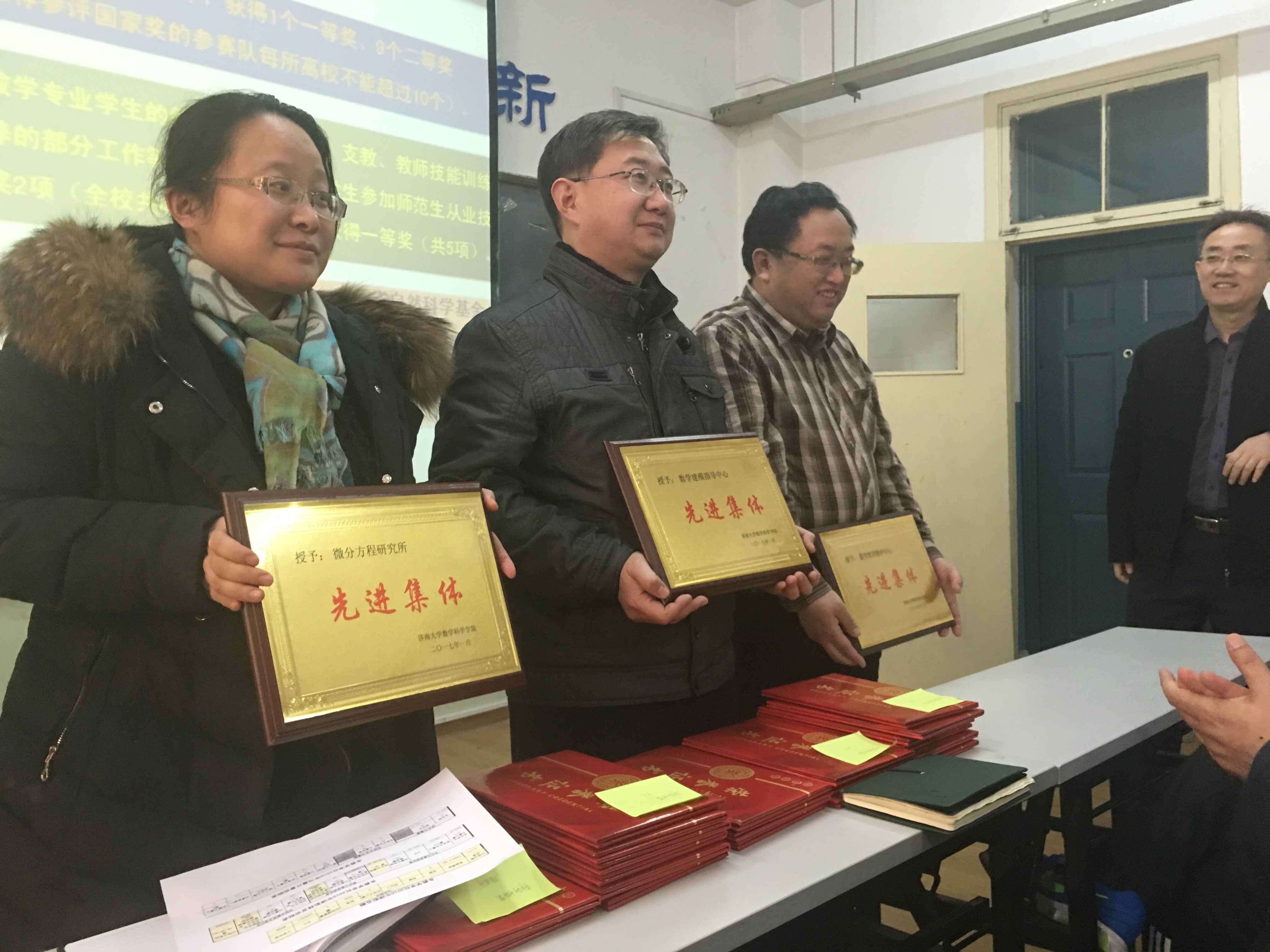2016年十大事件;表彰了数学建模指导中心、数学教育教研中心、微分方程研究所等先进集体;表彰了优秀科研工作者孙红卫、孙元功、孙书荣、陈观伟、张娜、李楠;表彰了优秀教学工作者张苏梅、苗丽安、孙书荣、吴鸿华、王洪凯、宋玉成;表彰了评教优秀的前六名教师吕洪波、祁晓光、张培龙、马 超、吴兆荣、赵 燕;表彰并奖励了班级考研成绩优秀奖的李可峰;表彰并奖励了科创工作开拓奖的徐法升;表彰并奖励了工会活动积极分子马巧灵、刘友谊、赵华磊。