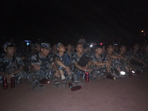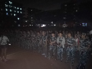 各连队于学生公寓5号楼篮球场举行拉歌训练并参加拉歌比赛。