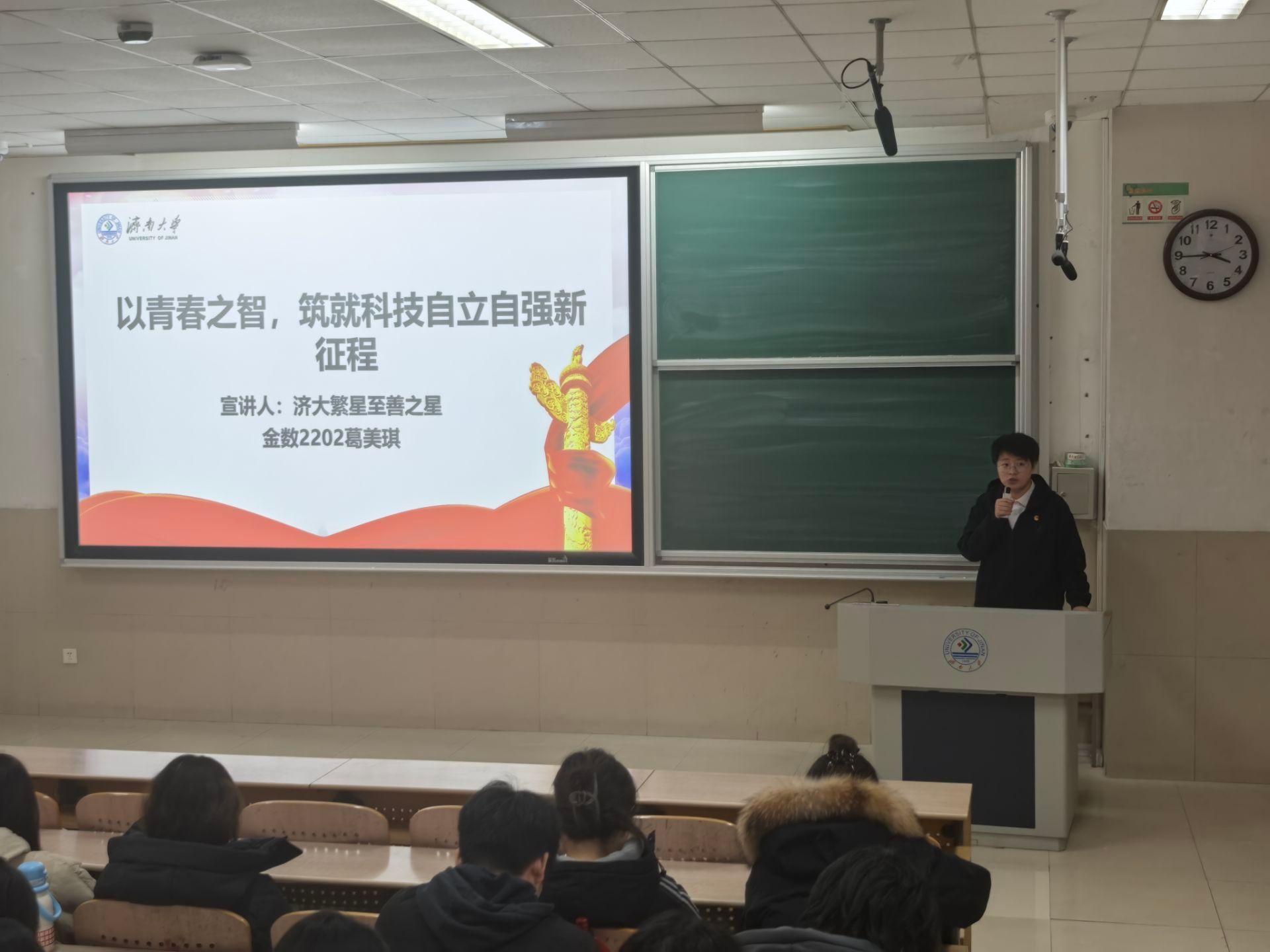 第九届“济大繁星”获得者葛美琪应邀进行宣讲。各年级学生党员及主要学生干部参加学习活动。