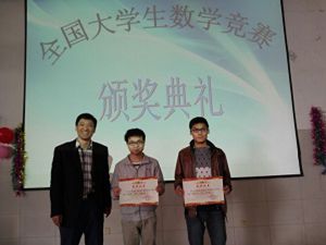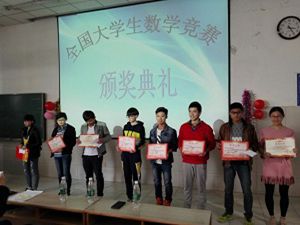 负责人及获奖学生上台领奖。随后,教师代表李可峰发表讲话,他对获奖学生表示衷心的祝贺,并以大学生通过数学竞赛在研究生考试中占得先机为例,说明了数学竞赛的重要性,鼓励学生积极参加新一届的数学竞赛。