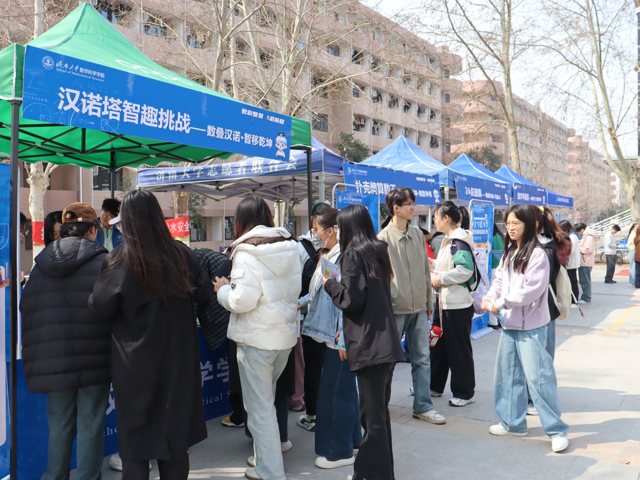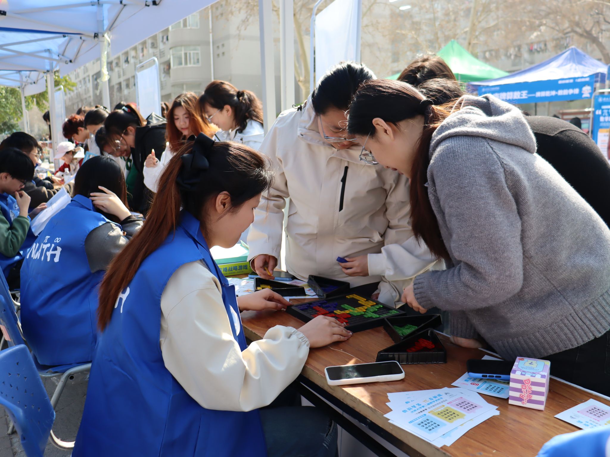 启动仪式前后,师生共同参观数学科普文化展览并体验“π仔嘉年华”趣味游园会,在轻松愉悦的氛围中感受数学的魅力与乐趣。游园会项目覆盖基础运算、逻辑推理、空间思维、跨学科融合等维度,各关卡兼顾挑战性与体验感。数独大作战考验逻辑推理与全局统筹能力,数字飞花令实现数学与古典诗词的跨界融合,扑克牌算数王比拼速算技巧与策略思维,数字华容道锻炼空间推理与路径规划能力……活动现场人气高涨,不时传来阵阵喝彩。