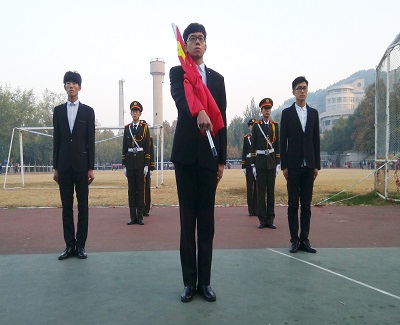 在全体学生的注目礼下,飒爽英姿的国旗护卫队队员们护送鲜艳的五星红旗进场。行礼完毕,伴随着庄严的《中华人民共和国国歌》,五星红旗冉冉升起,迎风飘扬。在场的每一个人身怀着对祖国无限的热爱和崇高的敬意对五星红旗行注目礼。2015级学生代表刘博宇发表演讲“今日之责任,不在他人,而全在我少年。少年智则国智,少年富则国富,少年强则国强”。并庄严承诺:时刻铭记学校“弘毅 博学 求真 至善”的校训,勿忘昨天的苦难与辉煌,无愧今天的责任与使命,不负明天的梦想与追求。