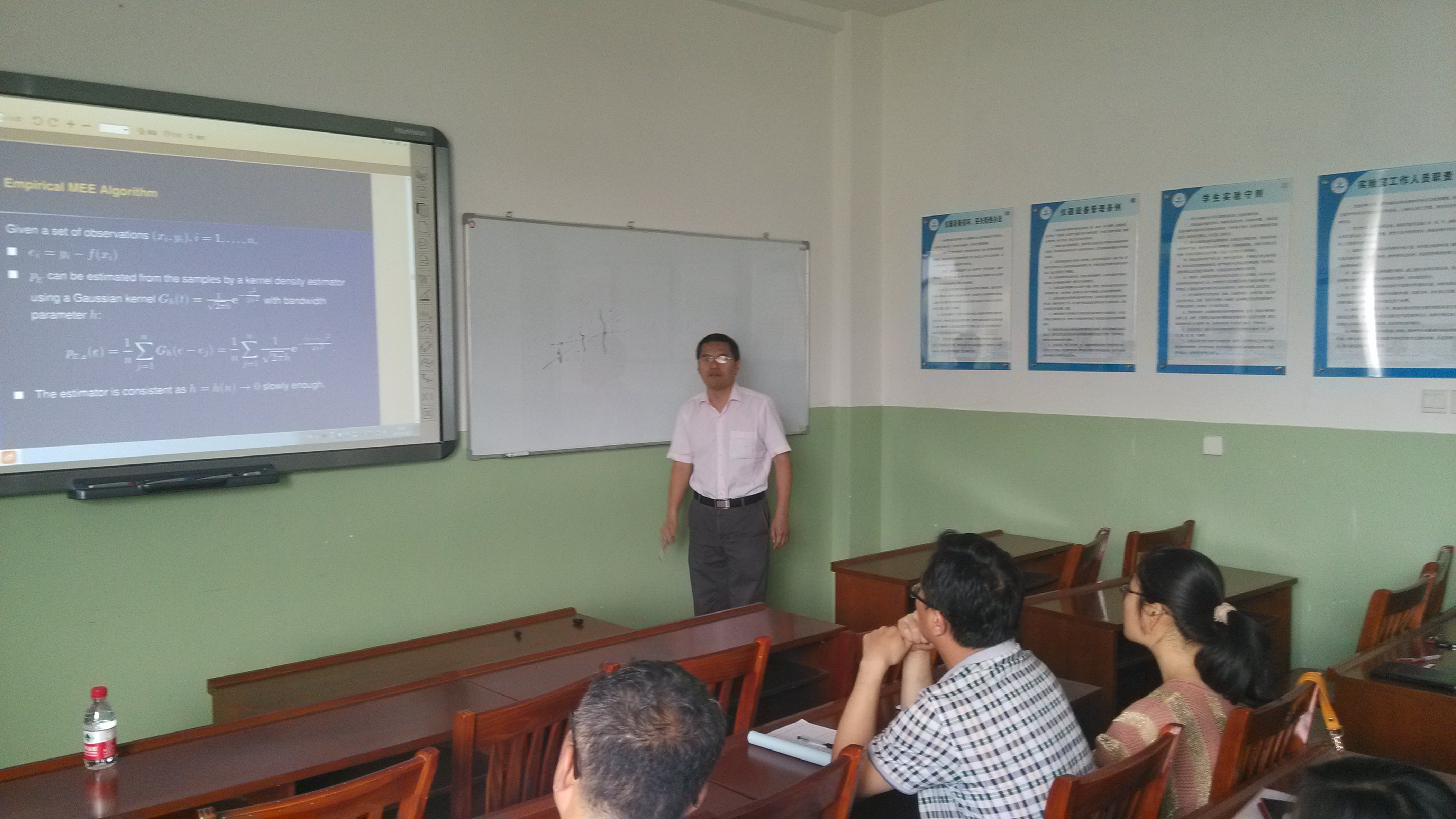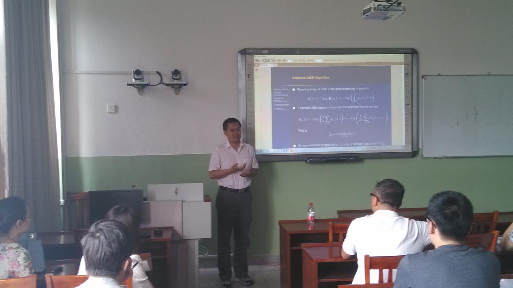 吴强博士的报告题目为《Consistency Analysis of the Minimum Error Entropy Algorithm》。报告中,吴强博士详细介绍了回归学习、基于信息论中Shannon熵与Renyi熵的MEE回归算法的由来、以及MEE回归算法的一致性分析,并提出了进一步思考的一些问题。会后,草榴社区