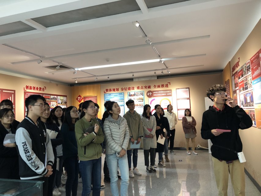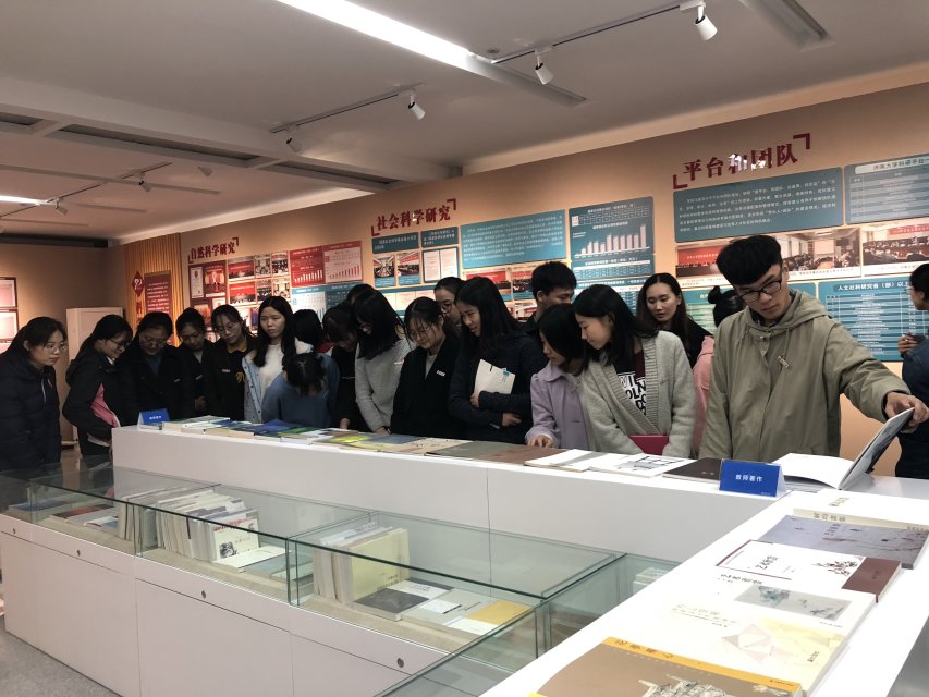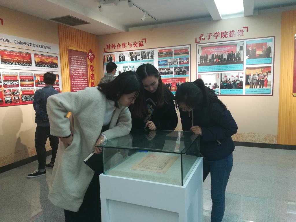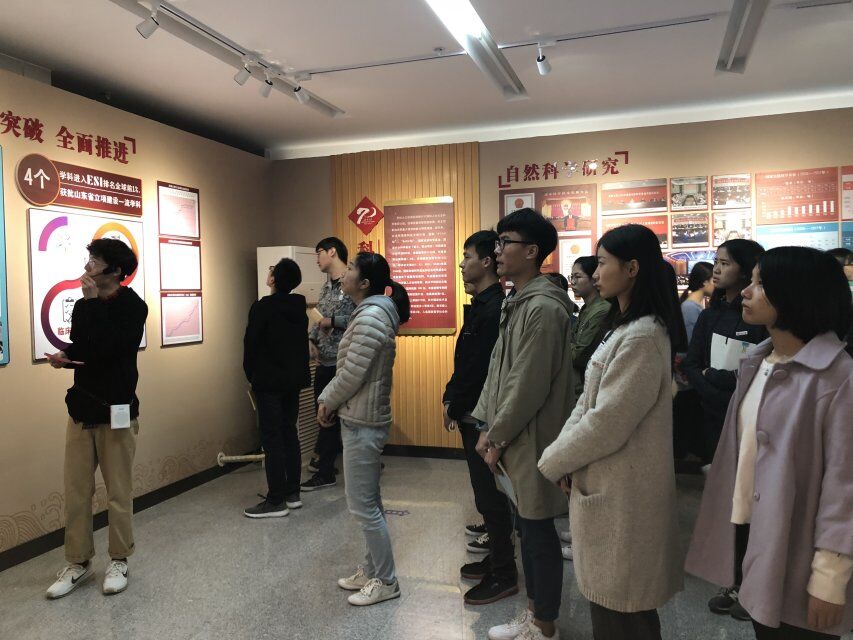 学生党支部成员走过一块块展板,从1948到2018、从博山到济南、从华东财办工矿部工业干部学校到如今蓬勃发展的草榴社区