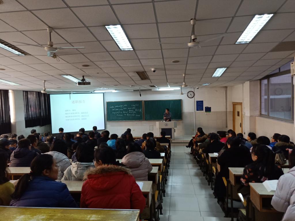 本次会议的主题是参加本年度职称评审的老师述职。参与述职的教师依次上台做了述职报告,从思想品德及集体贡献、教学情况、科研情况等方面展开了具体阐述。
