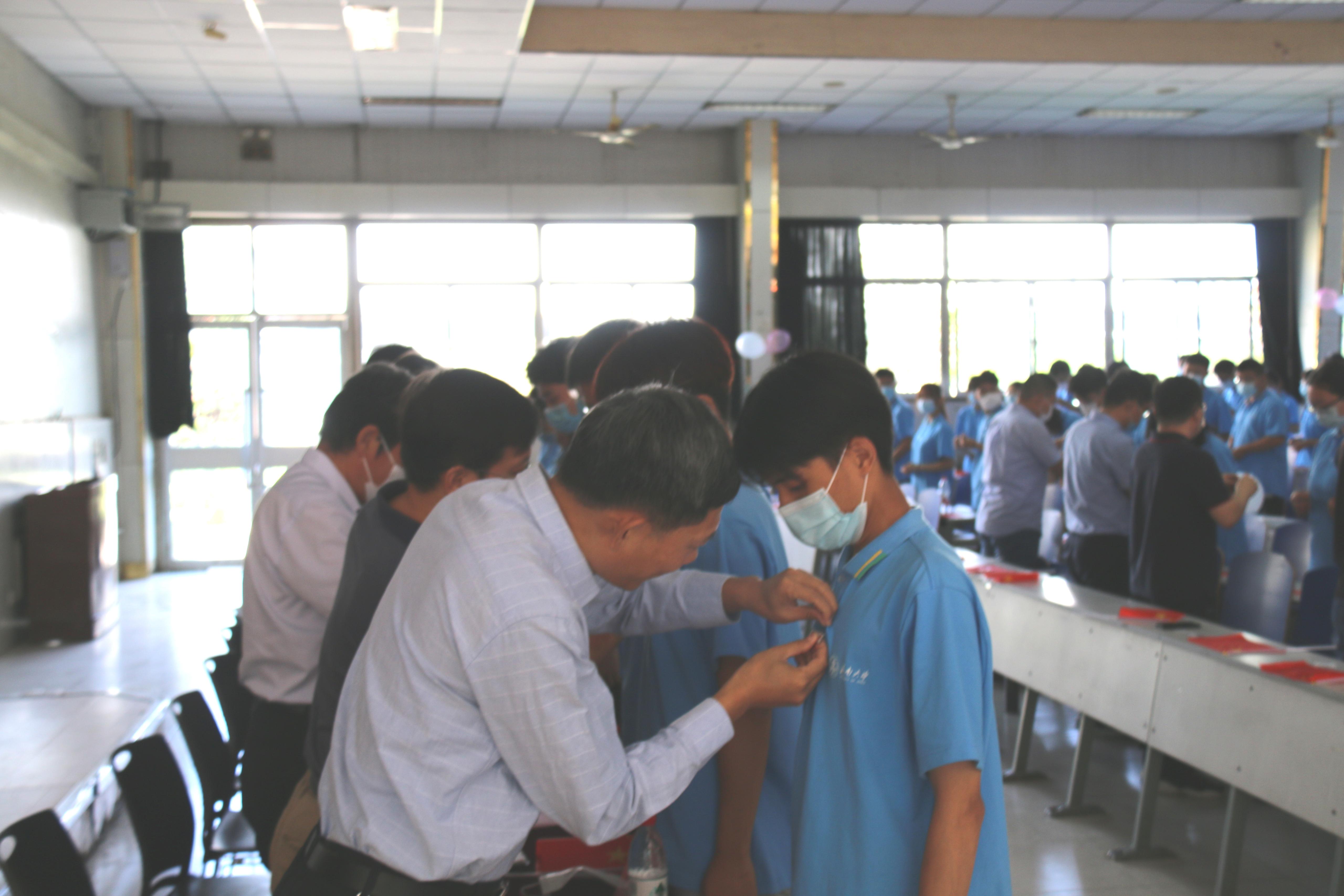 党委书记侯启海发表讲话;各系部主任、班主任辅导员为新生佩戴校徽。