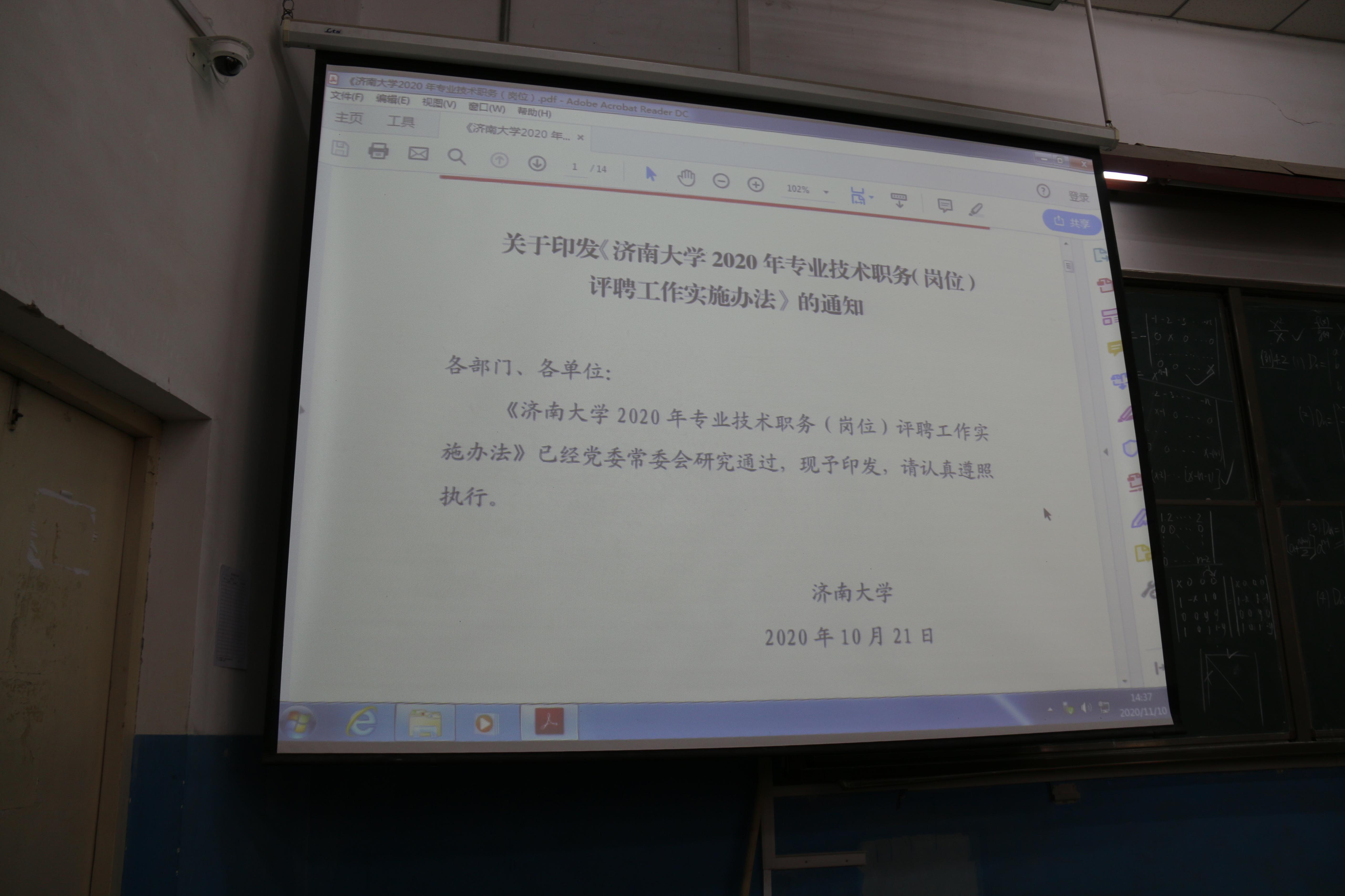 会严格遵照学校文件精神开展工作,本着对教师负责的态度,坚持标准、严格程序,确保职称评聘工作公平、公正、规范。二是要求全体教职工认真学习领会党的十九届五中全会精神以及审议通过的《中共中央关于制定国民经济和社会发展第十四个五年规划和二〇三五年远景目标的建议》相关内容,并将会议精神和学习内容贯彻落实到教学科研工作中。三是作为高校教师要坚守住正确意识形态阵地,始终坚持党的教育方针,始终坚持“两个维护”和“四个意识”,坚决不允许教师在课堂上发表或者传播与党的路线方针政策不一致的言论,要始终坚持与党的路线方针政策保持高度一致。四是疫情防控不能松懈,全体教职工要继续严格执行学校疫情防控要求,坚持“非必要不外出”的原则,离济返济严格执行请销假制度。