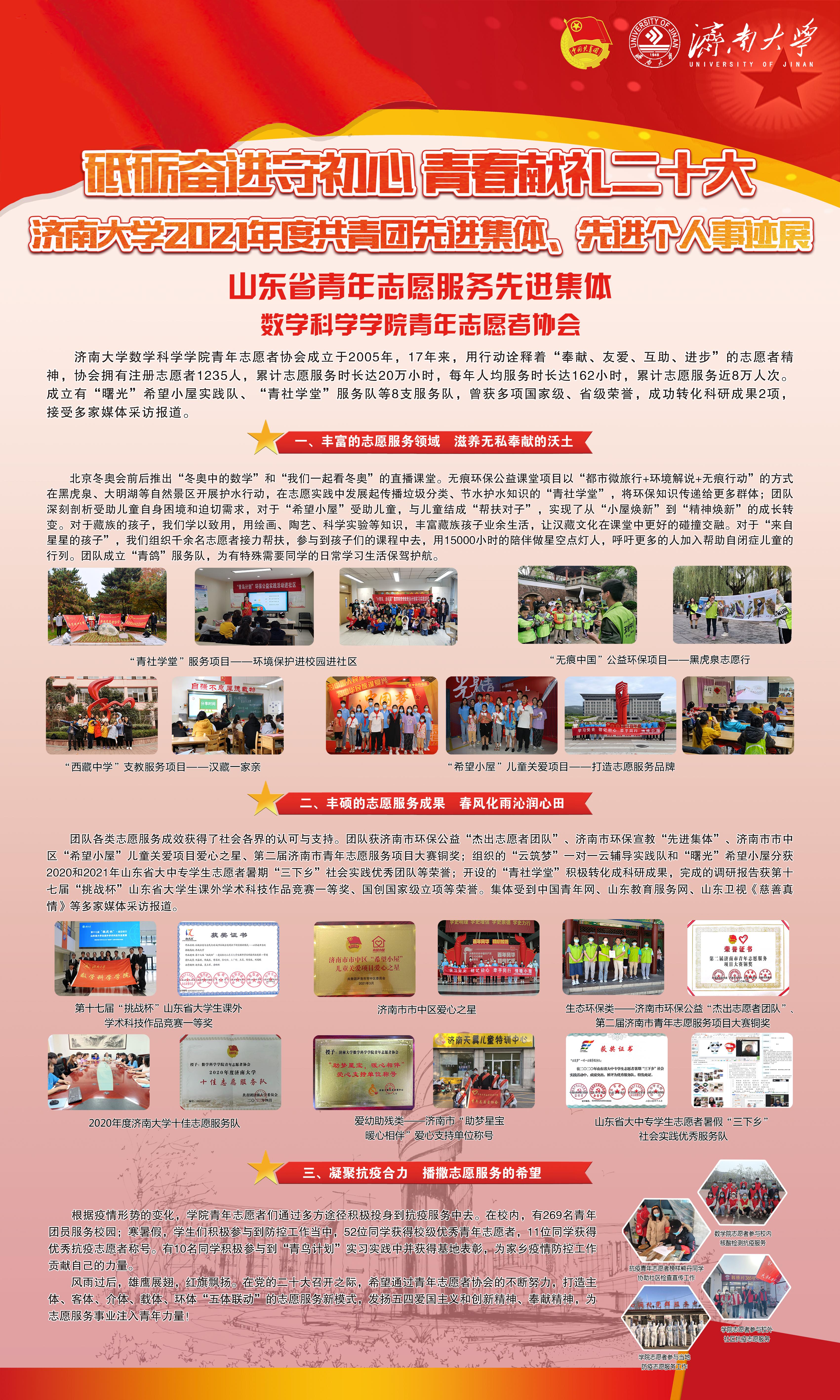 为表彰先进、树立典型,激励全省各级团组织和广大团员青年、团干部向先进学习、向优秀看齐,共青团山东省委决定授予青岛市青年志愿者抗疫突击队等50个集体山东省青年志愿服务先进集体称号。草榴社区青年志愿者协会榜上有名,成为2021-2022年度我校唯一一支获此殊荣的志愿者团队。