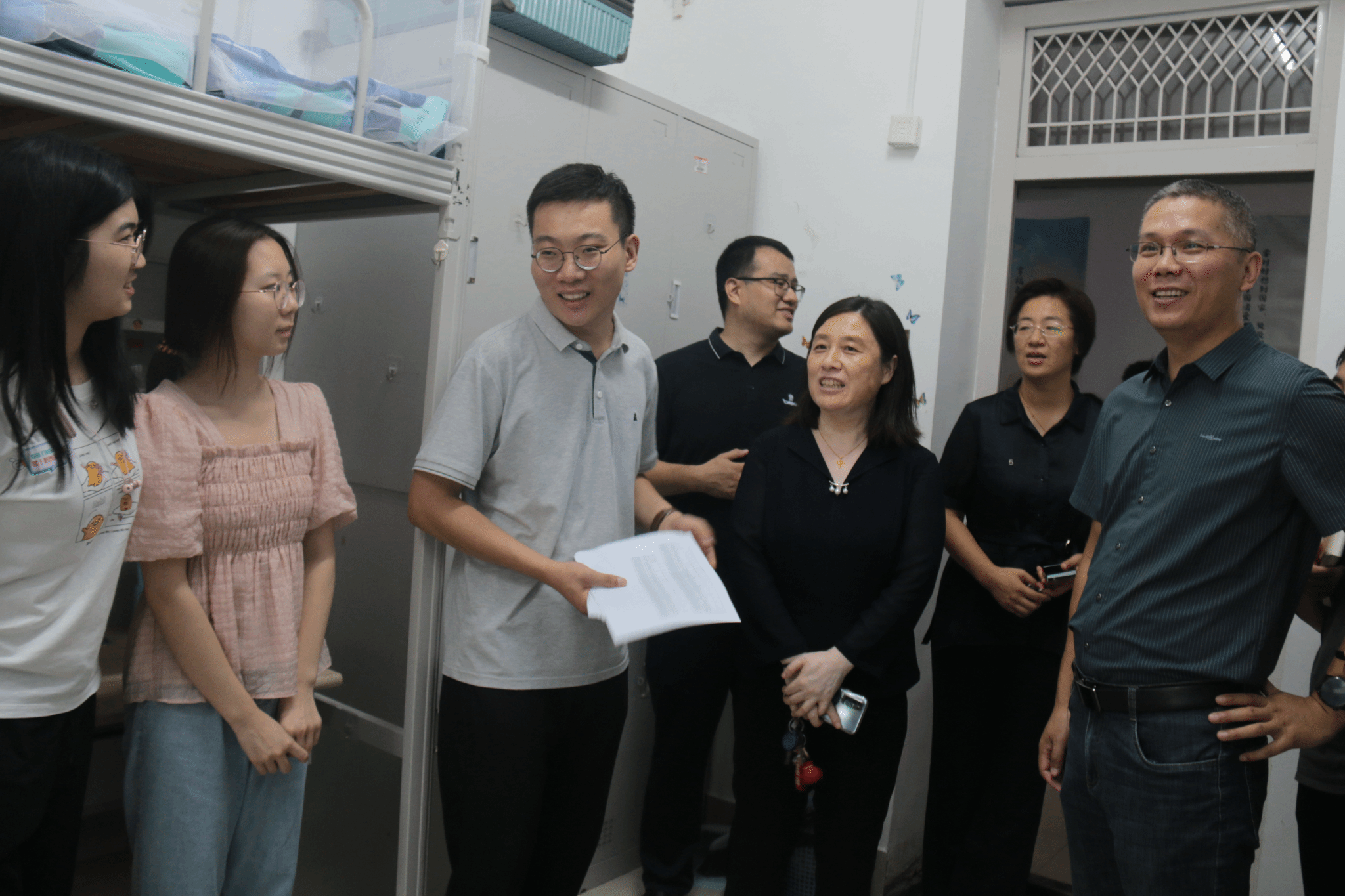 崔英静一行走进新生宿舍,看望了已经入住的学生,听取学生和家长们对迎新工作和宿舍管理服务的意见建议,并详细询问了大家的生源地、报到感受、学习生活等情况,勉励同学们主动适应大学生活,把个人成长融入国家发展之中,努力取得更优异的成绩!