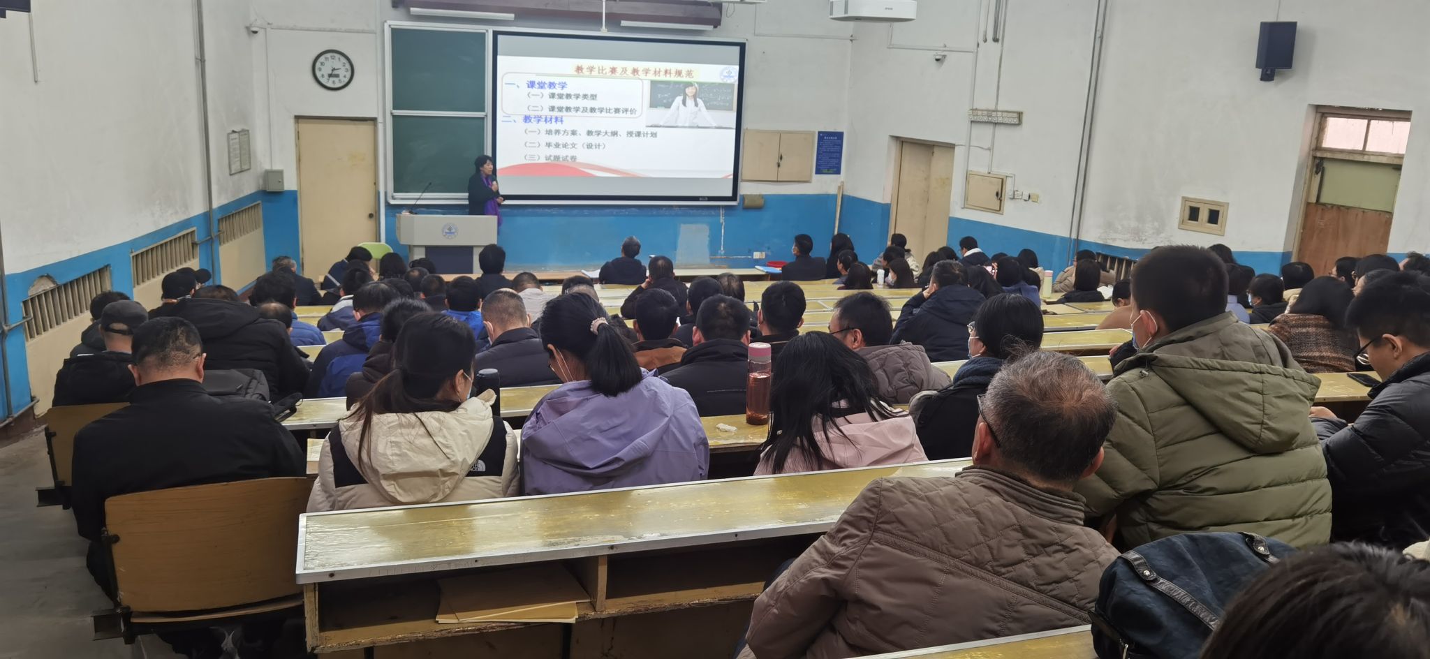王元秀教授做专题讲座。王元秀以“教学比赛及教学材料规范”为题,在课堂教学方面,详细讲解了课堂教学类型和课堂教学评价指标体系,结合教学督导过程中的实际案例对五大项教学评价指标进行了详细的剖析与解读;在教学材料方面,从培养方案、教学大纲、授课计划,试题试卷和毕业论文(设计)分别介绍和展示了相关规范做法。