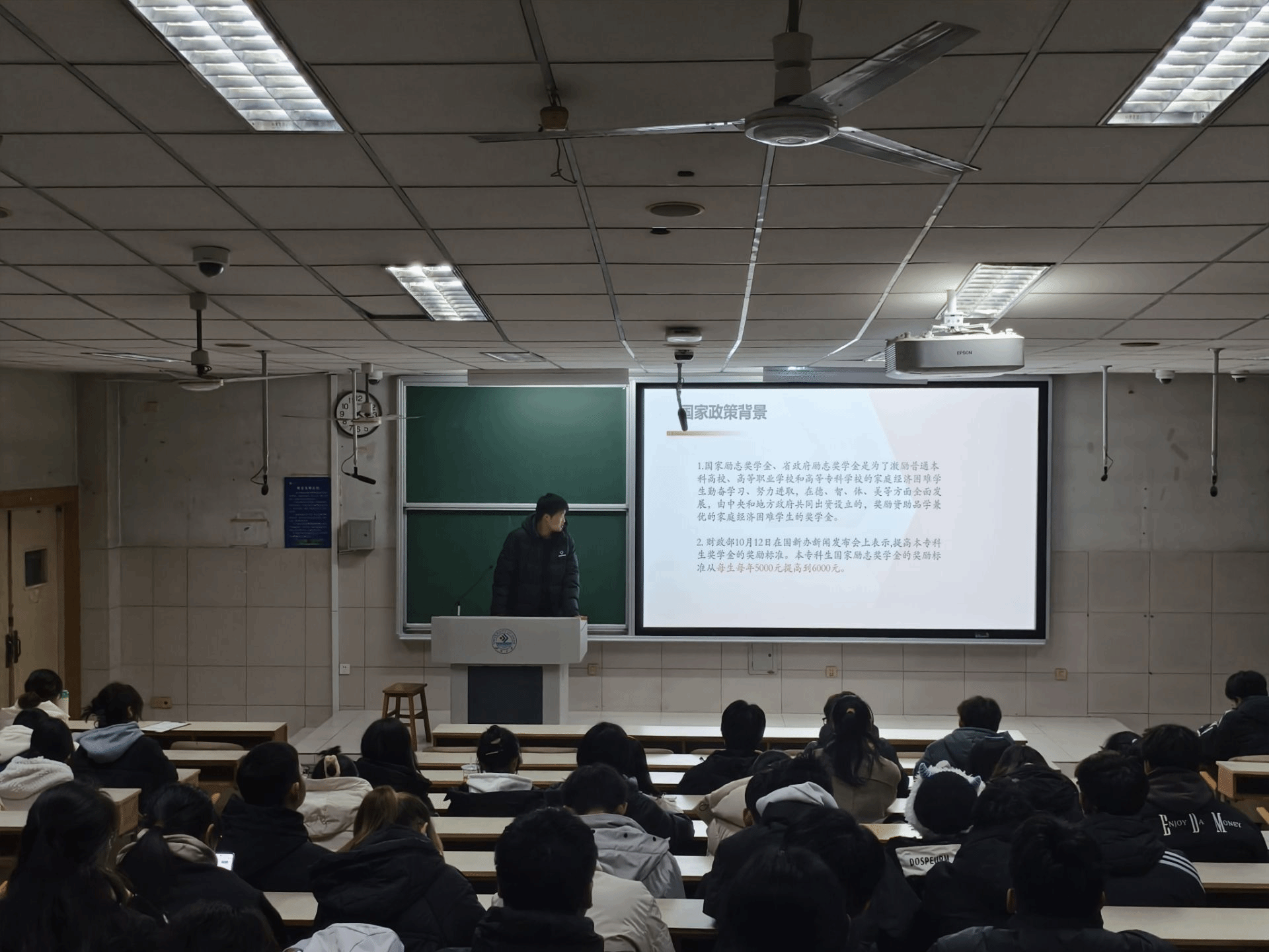活动开始,资助服务部陈鼎首先对国家助学金的申请、评议、认定与发放等关键环节进行了详细的梳理和解答,让同学们对整个流程有了更深刻的认识。随后,陈鼎提到了专门针对品学兼优但家庭经济困难的学生所设立的国家励志奖学金和省政府励志奖学金,此类奖学金的宗旨在于激励和鼓舞广大青年学子,鼓励他们积极向上,勤奋刻苦地学习。通过细致的讲解,让家庭经济困难的学生深刻了解到国家和社会对他们的关心和支持。最后,陈鼎鼓励受到帮助的同学们心怀感恩,正确对待、合理使用奖助学金,自立自强、奋发向上,通过积极参与社会实践、志愿服务等活动,用自己的实际行动回馈社会,传递正能量,展现新时代大学生的责任和担当。