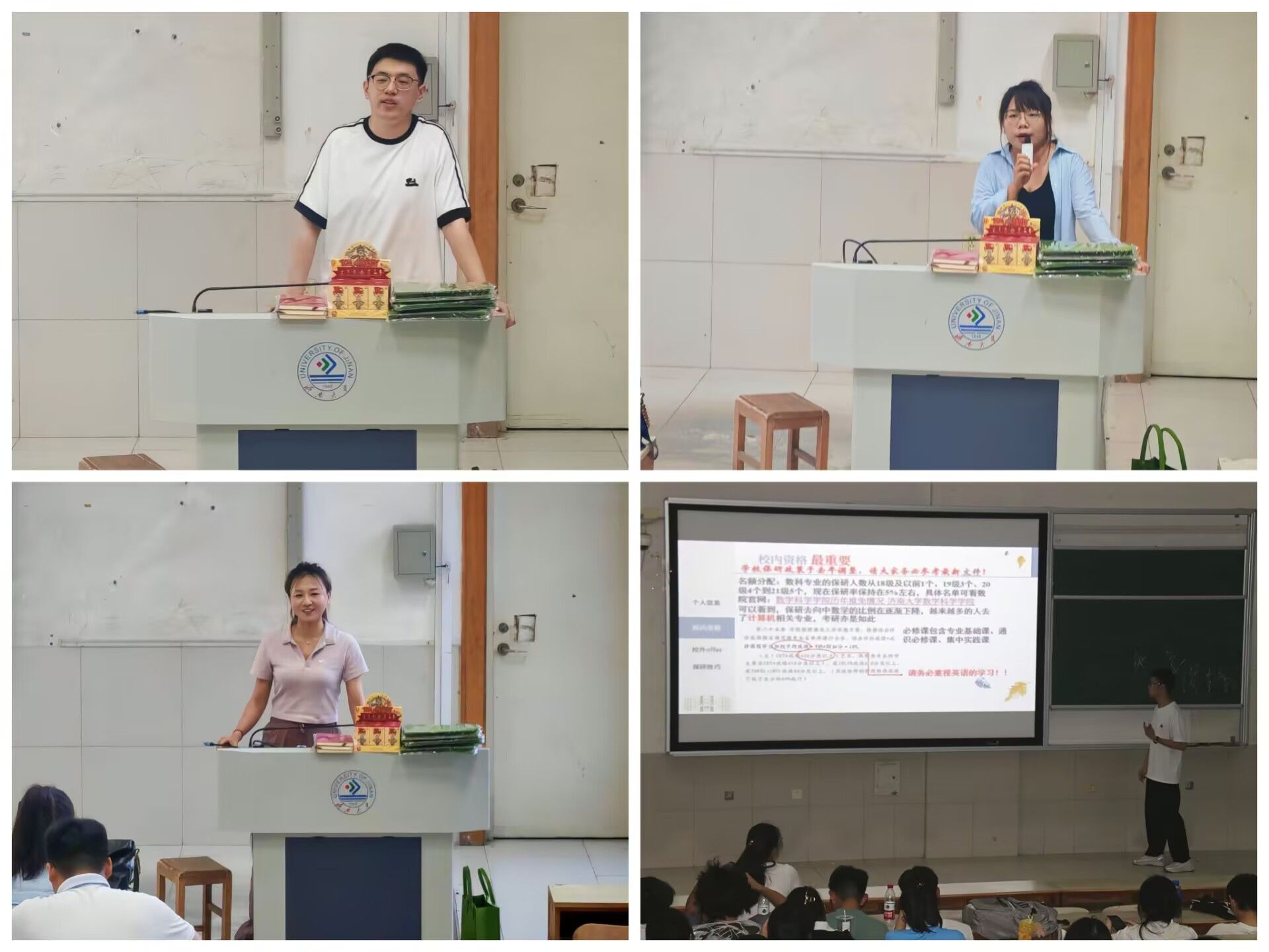 三位优秀学生代表及资深留学顾问张老师,围绕考研、保研、出国三个升学方向为同学们带来一场精彩纷呈的经验分享。分享会上,考研代表庞诗卉以自身从大一大二筑基到大三冲刺的备考历程为引,细致分享时间管理、资料筛选等实战心得,鼓励同学们坚定信心,持之以恒;赵骞飞则通过推荐实用考研资源、解读教辅使用方法及推荐公众号等方式,传递坚持精神。随后保研学长周文杰详细介绍保研的基本流程、所需材料以及个人经验,强调学术成绩、科研经历和社会实践在保研中的重要性。最后,留学顾问张老师则从留学学校选择、申请流程、材料准备及面试技巧等方面进行了详细介绍,助力同学们拓宽国际视野,明晰多元升学路径。