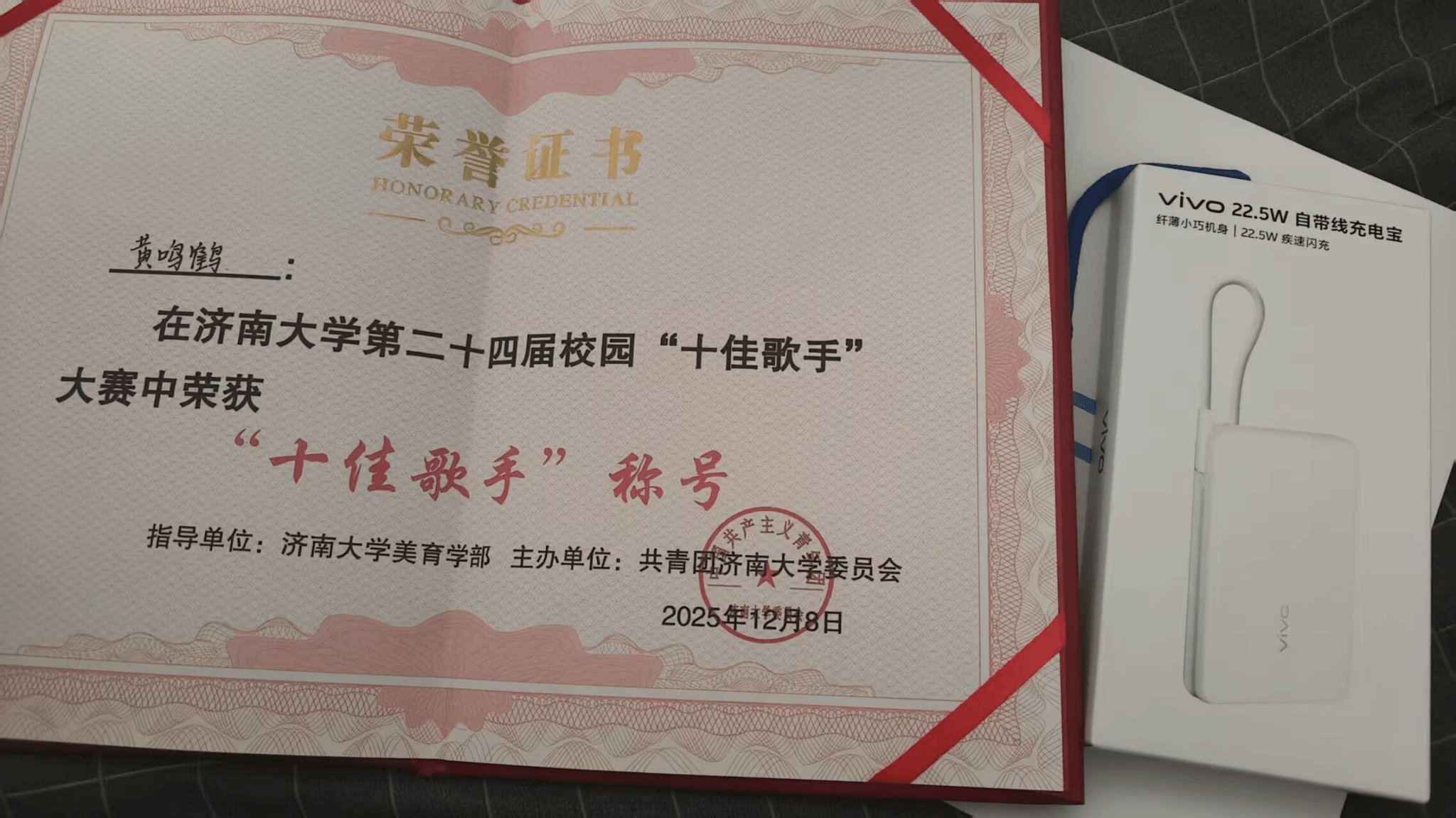 舞台之上,灯光流转间旋律缓缓铺陈。黄鸣鹤以极具感染力的嗓音,将歌曲背后的故事与情愫娓娓道来,他精准拿捏旋律起伏,更融入独属于自己的理解与诠释,低沉磁性的声线搭配细腻真挚的情感表达,让现场观众沉浸式感受音乐艺术的独特魅力,赢得评委一致好评。作为数学专业学子,他在公式推演的严谨世界与艺术审美领域双向深耕。此次参赛不仅展现出数学学子全面发展的多元风采,更印证了美育对想象力、创造力的滋养作用,彰显了青春与艺术碰撞的无限可能。谈及获奖感悟,黄鸣鹤坦言:“音乐是生活里的一抹亮色,更是美育浸润心灵的重要载体,未来我会继续在热爱的道路上坚定前行,让审美素养成为成长路上的重要力量。”
