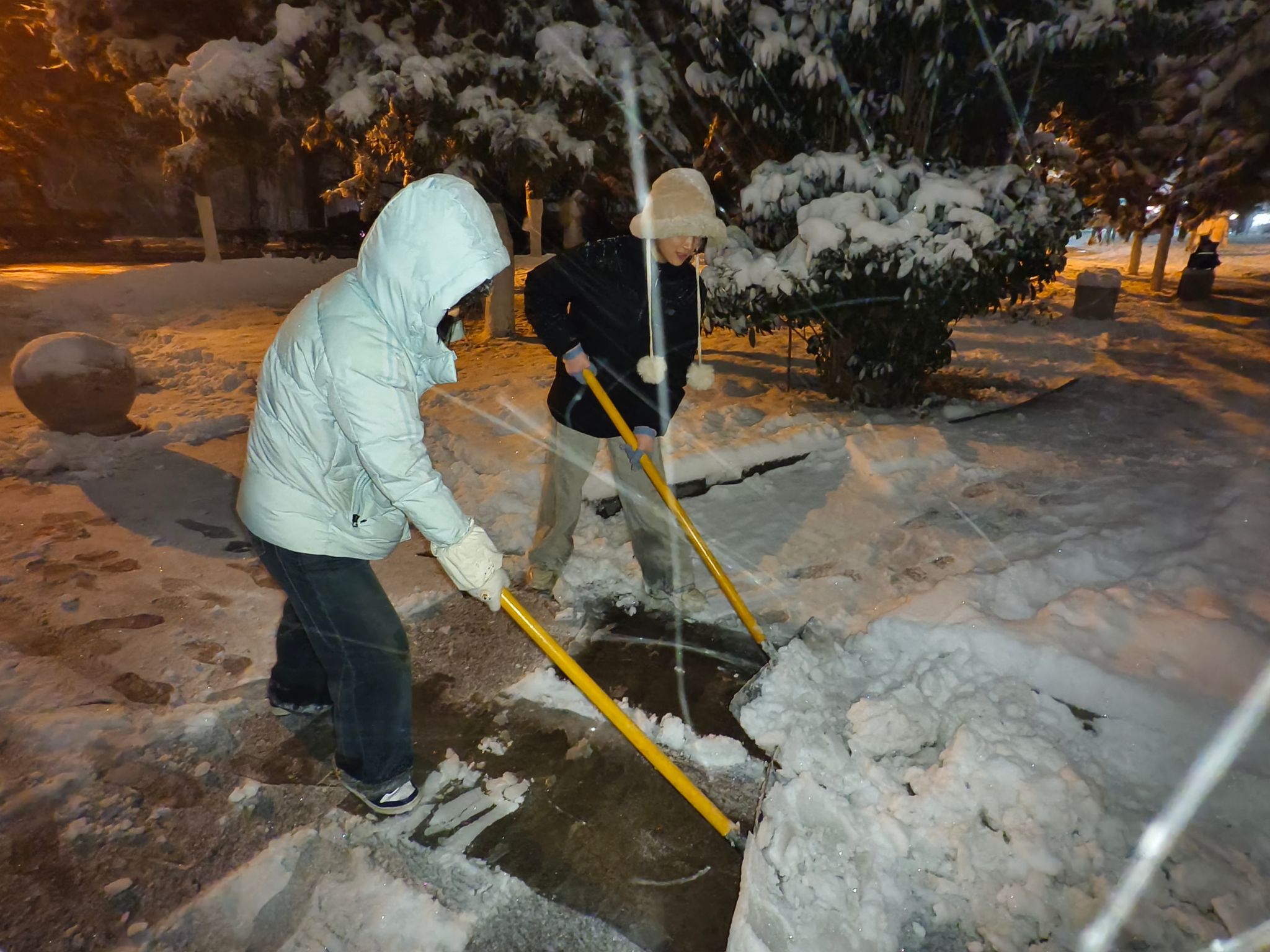 行动中,同学们不畏严寒,手持铁锹、扫帚等工具,重点对主校区第七教学楼前台阶、主干通道及梅花馆周边区域的积雪进行清理。寒风凛冽,雪花纷飞,但大家热情不减,分工有序,或奋力铲除坚冰,或仔细清扫浮雪。经过近两小时的持续奋战,主要通行区域的积雪被清除干净,数条安全通道被成功开辟,有效保障次日清晨师生的安全出行。