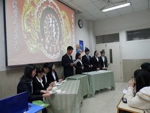 本次辩论赛首先的是进行三四名的争夺战,双方辩论队围绕“善行”还是“善心”是真善这一辩题展开辩论,双方据理力争、引经据典、思维严密,充分展示了辩手们巧舌如簧的应变口才。接下来进行的是一场极具搞笑的趣味辩论赛,幽默诙谐搞笑的语言将赛场气氛推向了高潮。然后进行的是期待已久的冠军争霸赛,双方辩手围绕“乱世应不应用重典”这一辩题展开辩论,双方各具一势,针锋相对,谁也不甘下风,激烈的气氛将赛场推至巅峰。最后进行的是颁奖环节,数学二班夺得最终的冠军,金数三班、数学一班分获第二名和第三名。