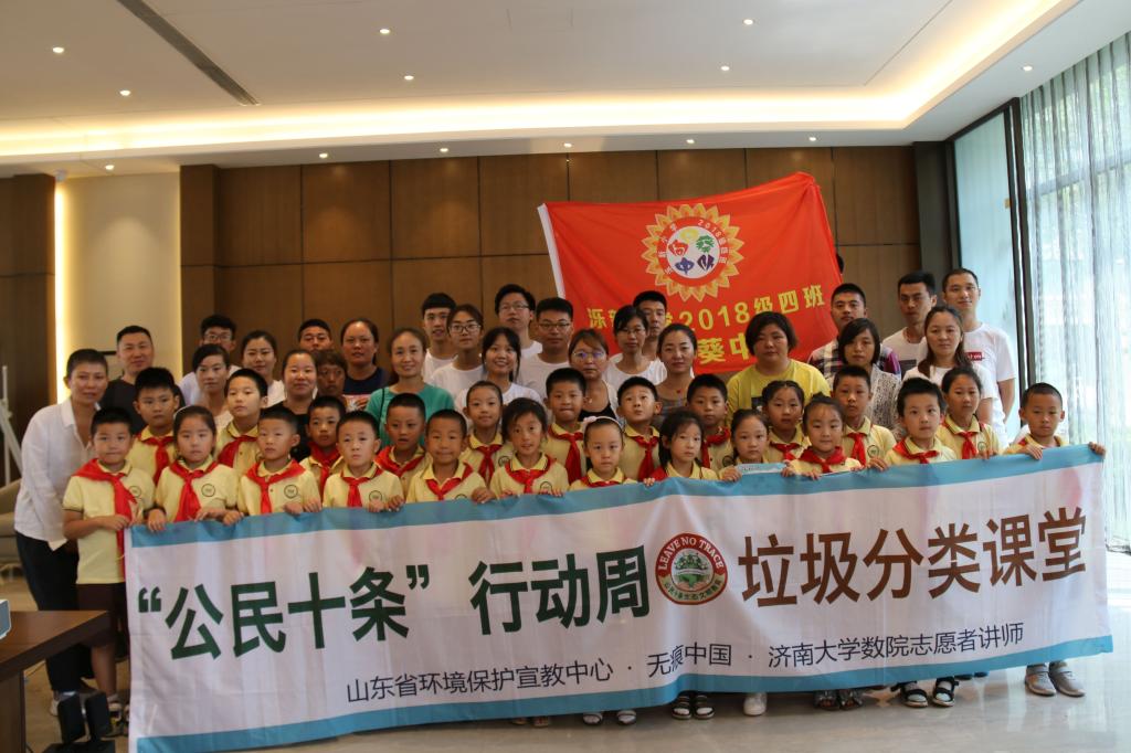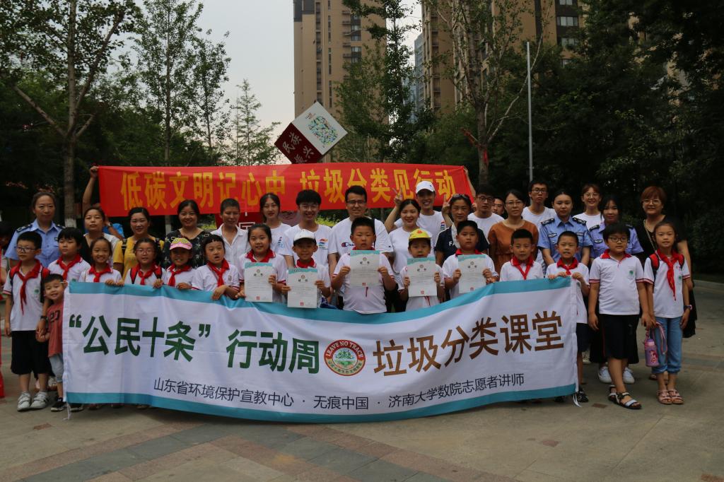 “无痕济南”暑期社会实践活动于7月20日在济南市泺新小学、济南市历城社区两个地方进行,17级辅导员吴立军也跟随志愿者来到历城社区,与小朋友们及家长共同参与本次《公民十条》垃圾分类课堂。