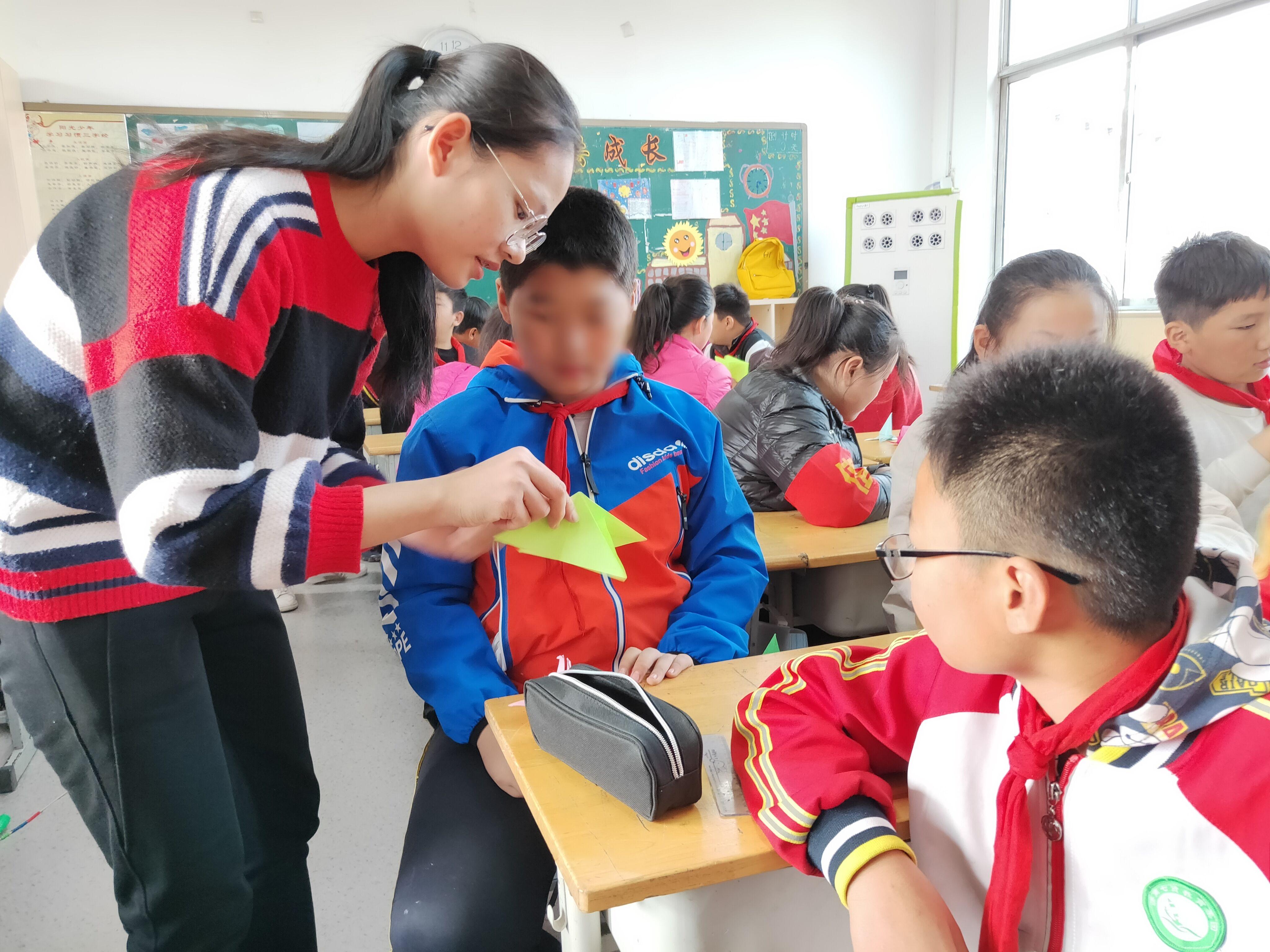时隔半个月,志愿者们再一次来到杨庄小学,内心满是期待,孩子们见到志愿者们,也仿佛见到老朋友一般,脸上满是阳光般灿烂的笑容。这一次,志愿者为孩子们带来了有趣折纸课。课堂一开始,志愿者向孩子们展示千纸鹤、钢琴、爱心等折纸作品,“哇”!孩子们被五颜六色的折纸作品深深吸引。在接下来的学习过程中,志愿者们耐心地讲述折纸的方法,手把手地带着孩子们折纸,对齐、折叠、再折叠,孩子们认认真真地重复老师们的动作,仿佛世界上最伟大的作品即将诞生一般,当孩子们完成自己心目中的作品之后,纷纷骄傲地向志愿者们展示。相聚的时间总是那么短暂,课堂尾声,孩子们和志愿者交换自己的作品,带着满满的收获,志愿者们向这群最可爱的孩子们挥手告别,并期待着下次相遇。