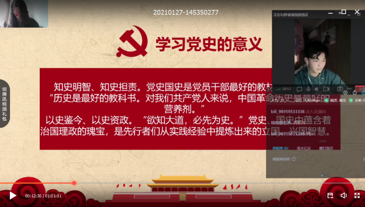 于1月27日下午三时在bilibili平台以线上的方式进行直播活动。希望通过此次活动让更多的同学深入的了解党史和新中国史并能够更好地体会党的革命精神。