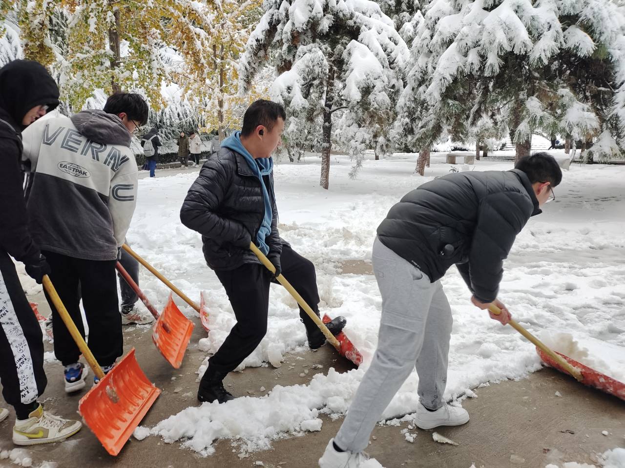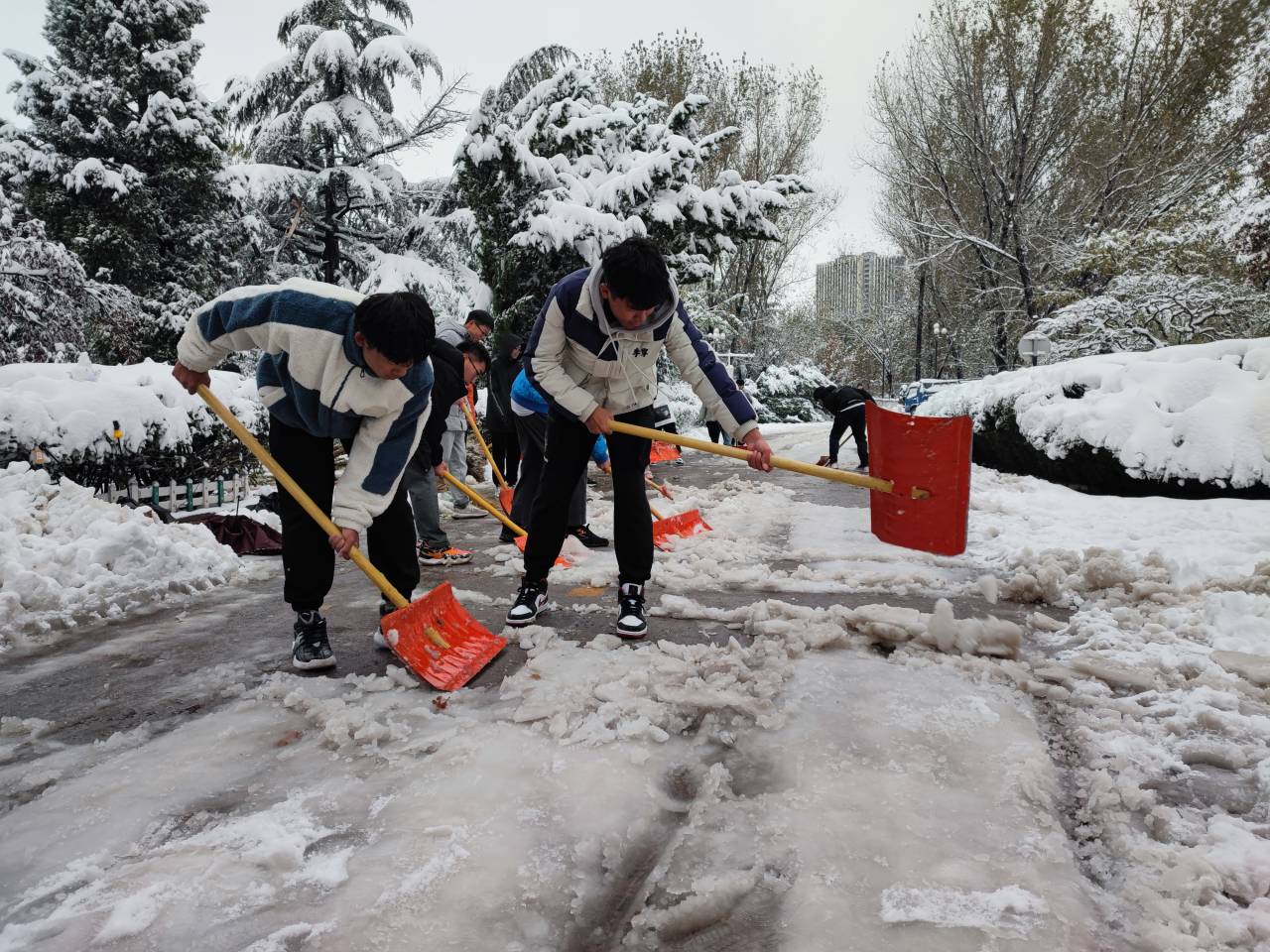 于11月7日下午组织各班开展清雪除冰工作,对主干道积雪及时清除。