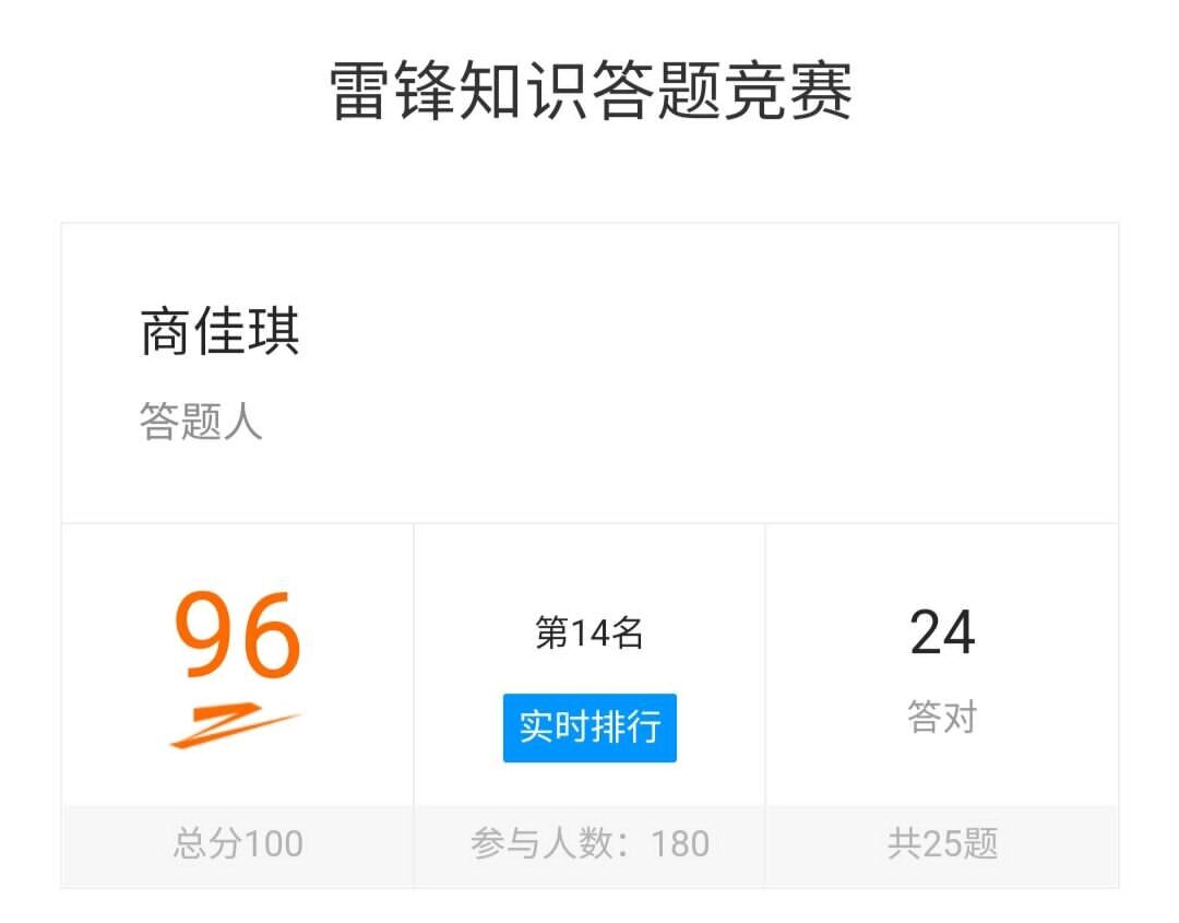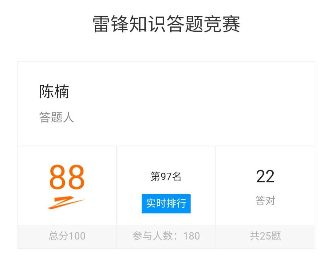 本次雷锋知识竞赛答题活动的顺利举行,不仅让同学们深入了解了雷锋,更让同学们体会到雷锋为实现共产主义而奋斗的献身精神、全心全意为人民服务的奉献精神、做一颗永不生锈的螺丝钉的钉子精神。让我们学习雷锋精神,弘扬雷锋精神,以身作则用切实行动去践行雷锋精神,做一棵高山岩石之松!