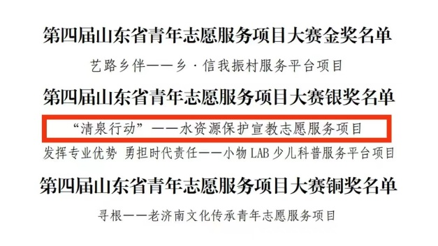 7月27日至28日,由团省委牵头主办的第四届山东省青年志愿服务项目大赛决赛在日照成功举办。经过激烈角逐,我校四个项目分获金银铜奖,其中由草榴社区于洋老师指导的“‘清泉行动’——水资源保护宣教志愿服务项目”在第四届山东省青年志愿服务项目大赛获得银奖,并于近日接到通知,该项目被山东省青年志愿者协会推荐参加第六届中国青年志愿服务项目大赛。