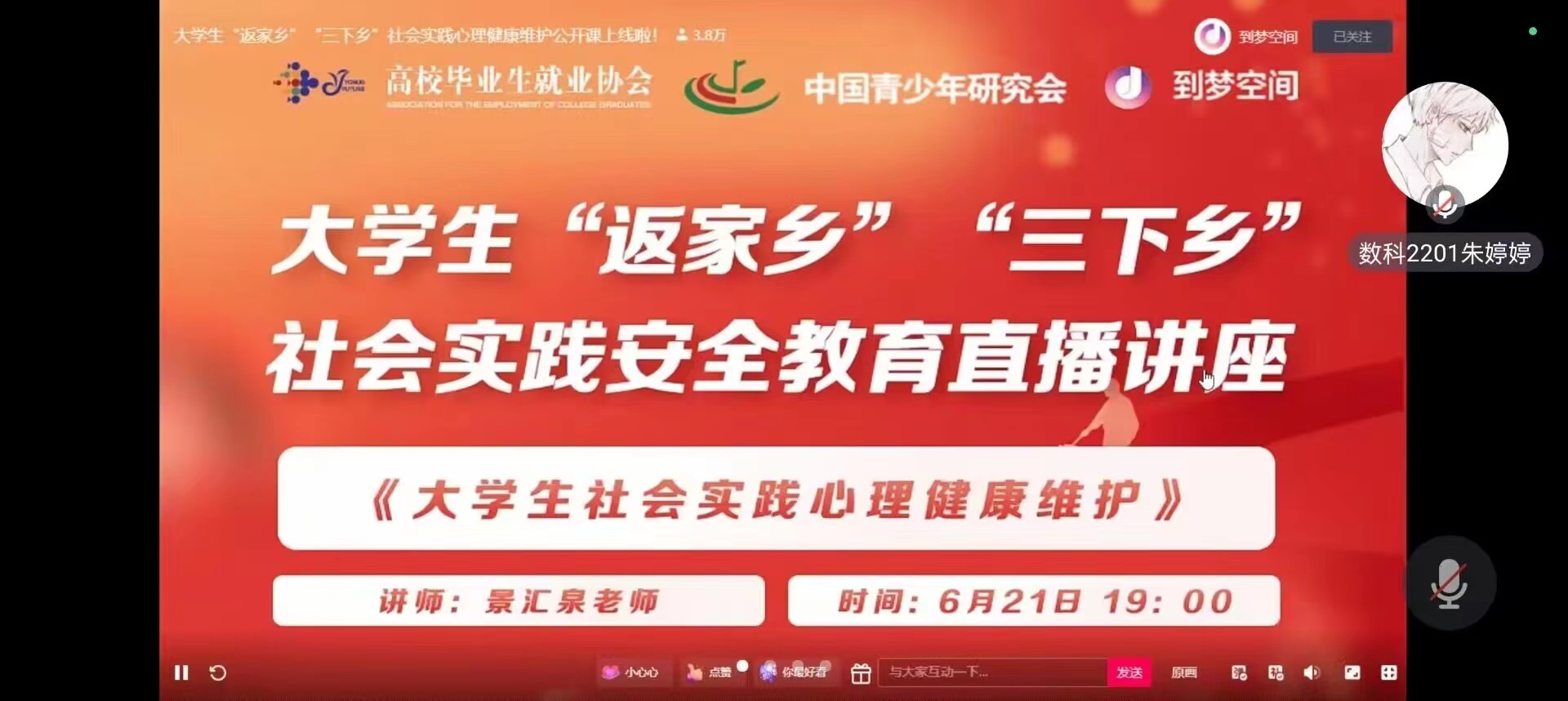 积极组织各实践队的同学们观看由学校团委联合到梦空间承办的2023年大学生“返家乡”、“三下乡”社会实践安全教育直播专题讲座,倡导同学们重视实践安全教育,推动实践教育的规范化、有序化、科学化开展。草榴社区