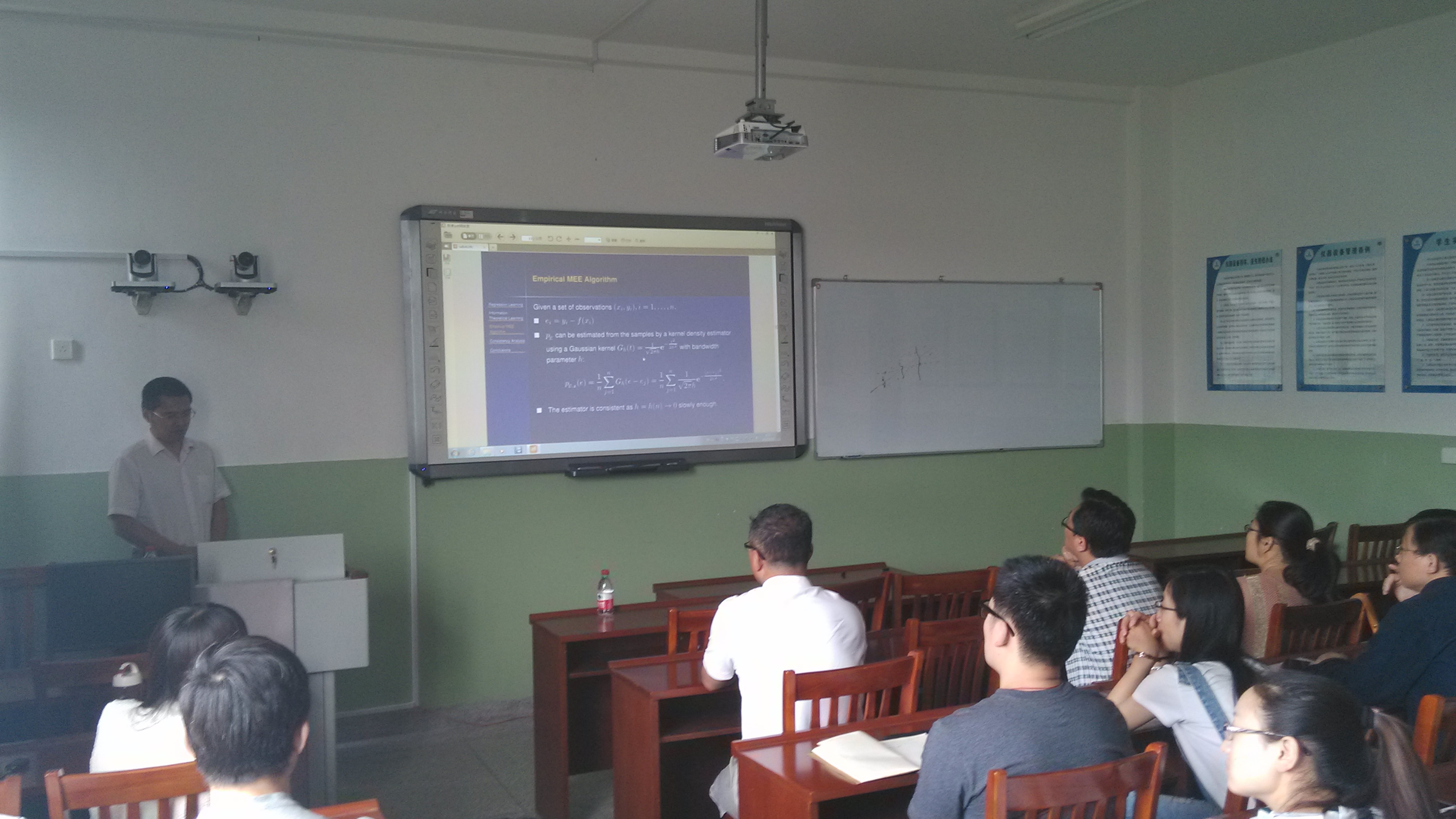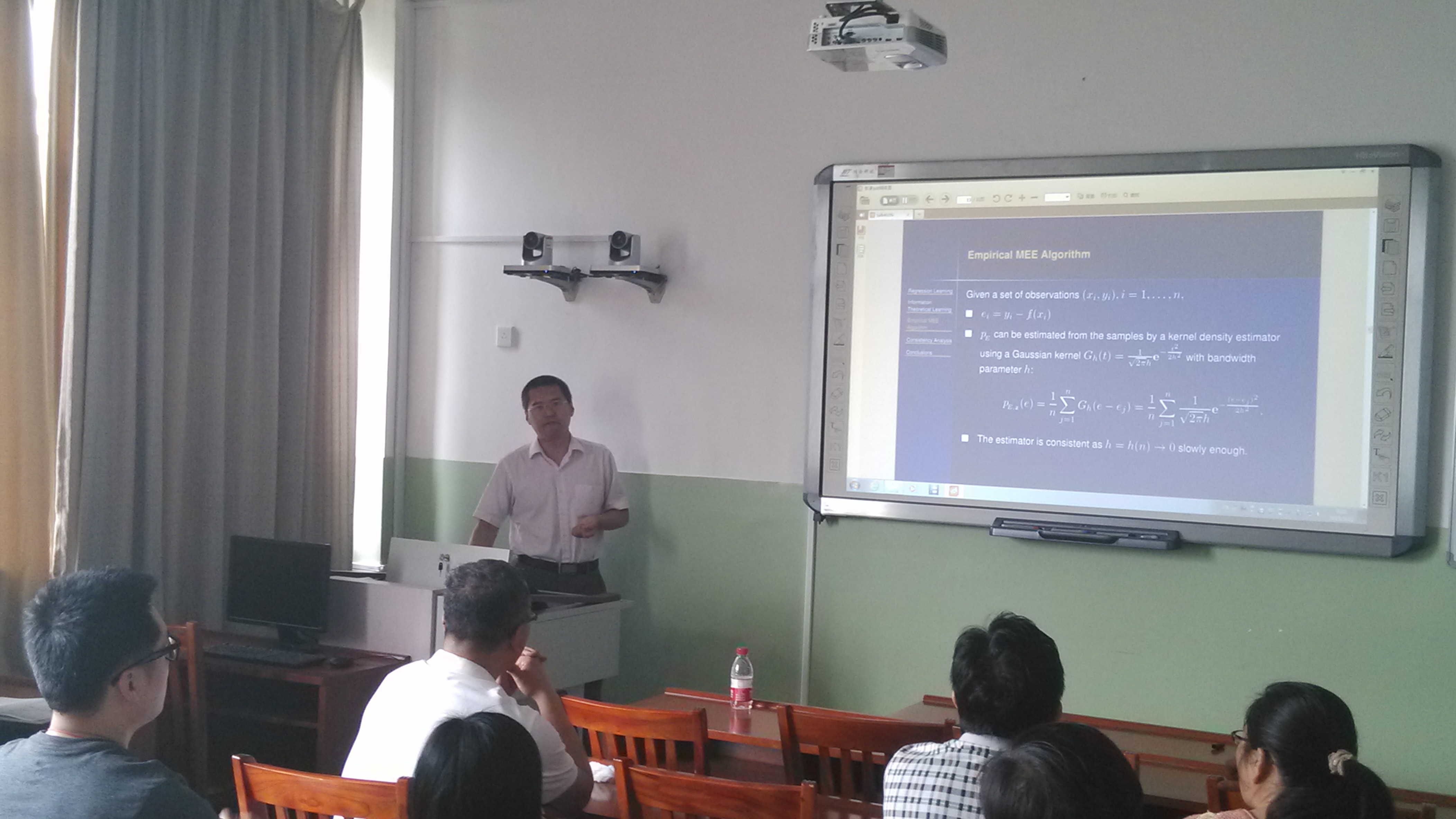 吴强博士的报告题目为《Consistency Analysis of the Minimum Error Entropy Algorithm》。报告中,吴强博士详细介绍了回归学习、基于信息论中Shannon熵与Renyi熵的MEE回归算法的由来、以及MEE回归算法的一致性分析,并提出了进一步思考的一些问题。会后,草榴社区